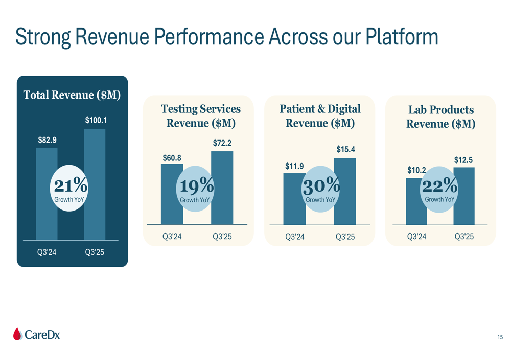 CareDx reported impressive financial results for Q3 2025, with total revenue reaching $100.1 million, representing a 21% year-over-year increase. This performance was driven by growth across all business segments and exceeded analyst expectations of $95.32 million.