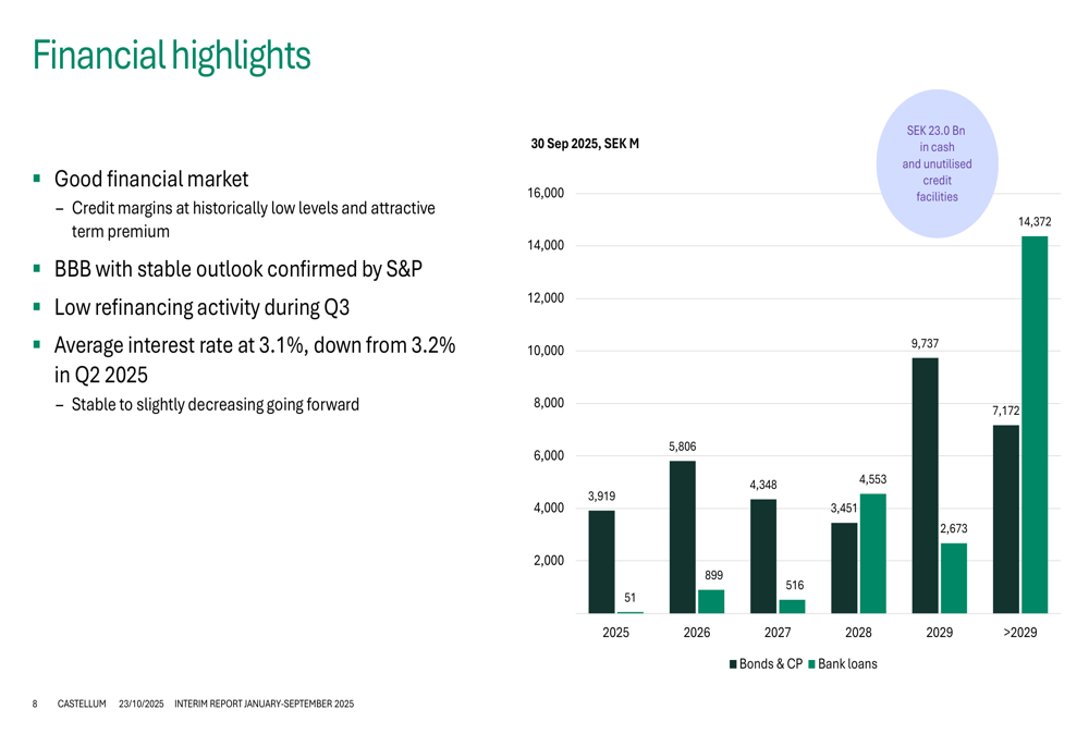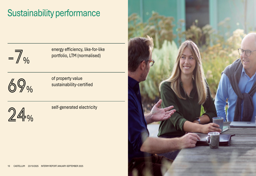 Despite these challenges, Castellum maintained a stable economic occupancy rate of 90.0% and reduced its average interest rate to 3.1% from 3.2% in the previous quarter. The company also highlighted its sustainability performance, with 7% improvement in energy efficiency and 69% of property value being sustainability-certified.