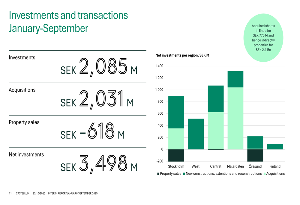 Despite market challenges, Castellum continued its investment program with total investments of SEK 2,085 million in existing properties and acquisitions of SEK 2,031 million, including shares in Entra worth SEK 770 million. Property sales amounted to SEK 618 million, resulting in net investments of SEK 3,498 million for the January-September period.