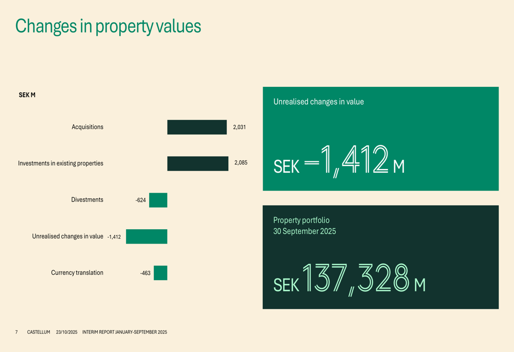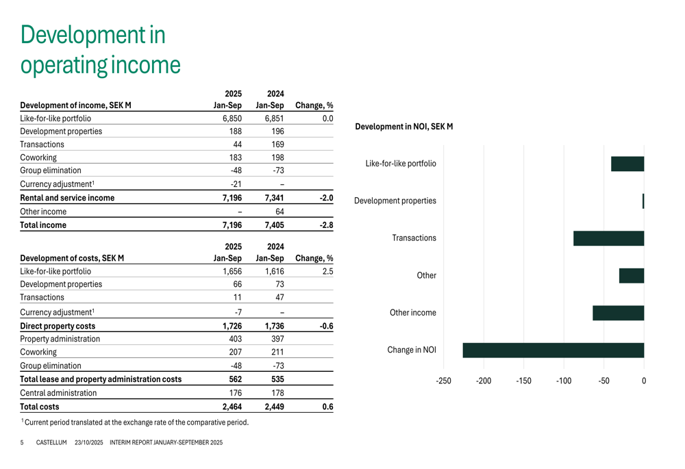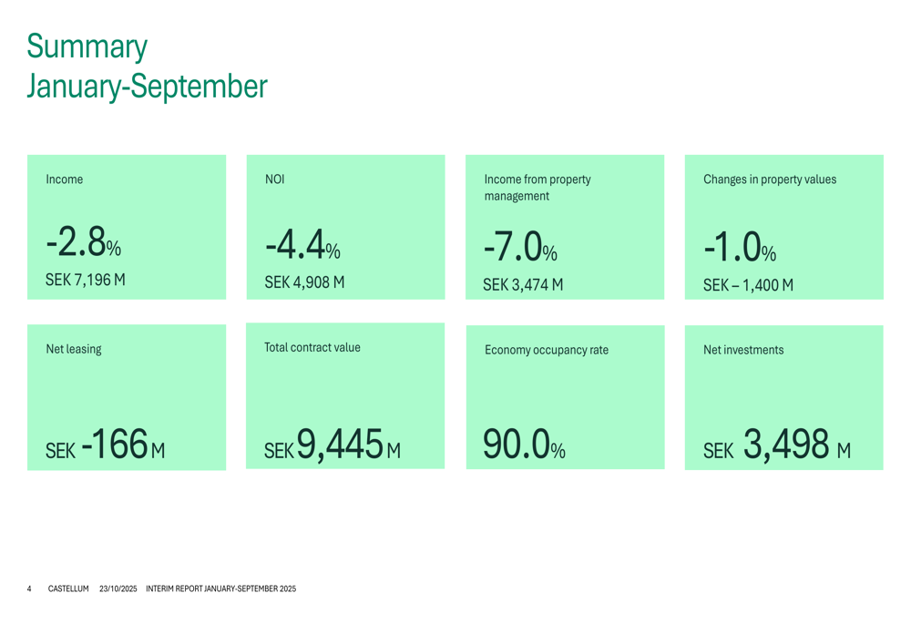 Castellum reported a 2.8% year-over-year decline in income to SEK 7,196 million for January-September 2025, with net operating income (NOI) falling 4.4% to SEK 4,908 million. The company recorded negative net leasing of SEK 166 million and property value write-downs of SEK 1,400 million, representing a 1.0% decrease in property values.