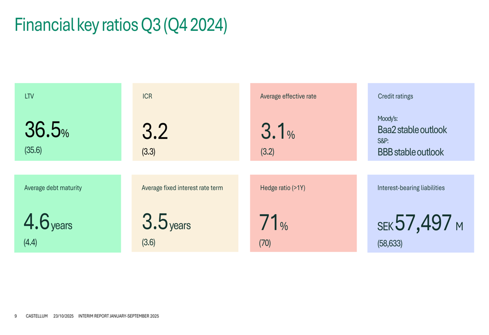 Castellum’s financial position remains relatively stable despite the challenging market conditions. The loan-to-value (LTV) ratio increased slightly to 36.5% from 35.6% in Q4 2024, while the interest coverage ratio (ICR) decreased marginally to 3.2 from 3.3.