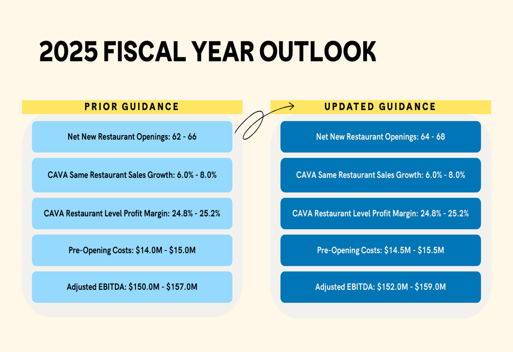 CAVA slightly raised its fiscal year 2025 guidance, reflecting confidence in its growth trajectory despite the moderation in same-restaurant sales growth. The updated outlook includes: