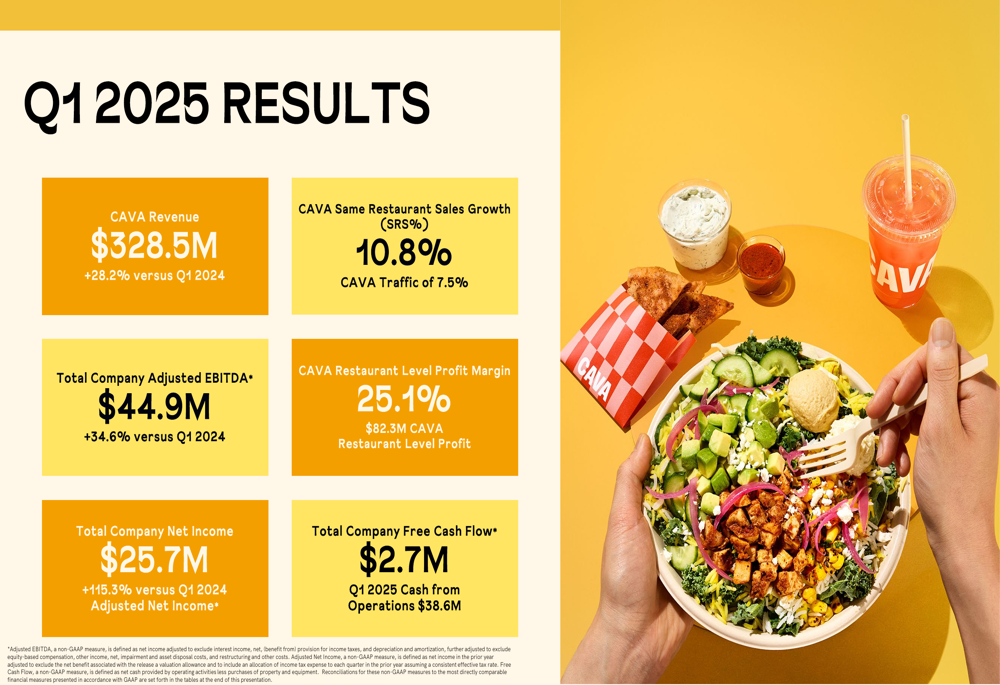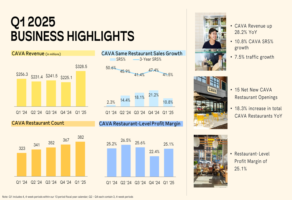 CAVA reported total revenue of $328.5 million for Q1 2025, representing a 28.2% increase compared to the same period in 2024. This growth was driven by both new restaurant openings and robust same-restaurant sales performance.