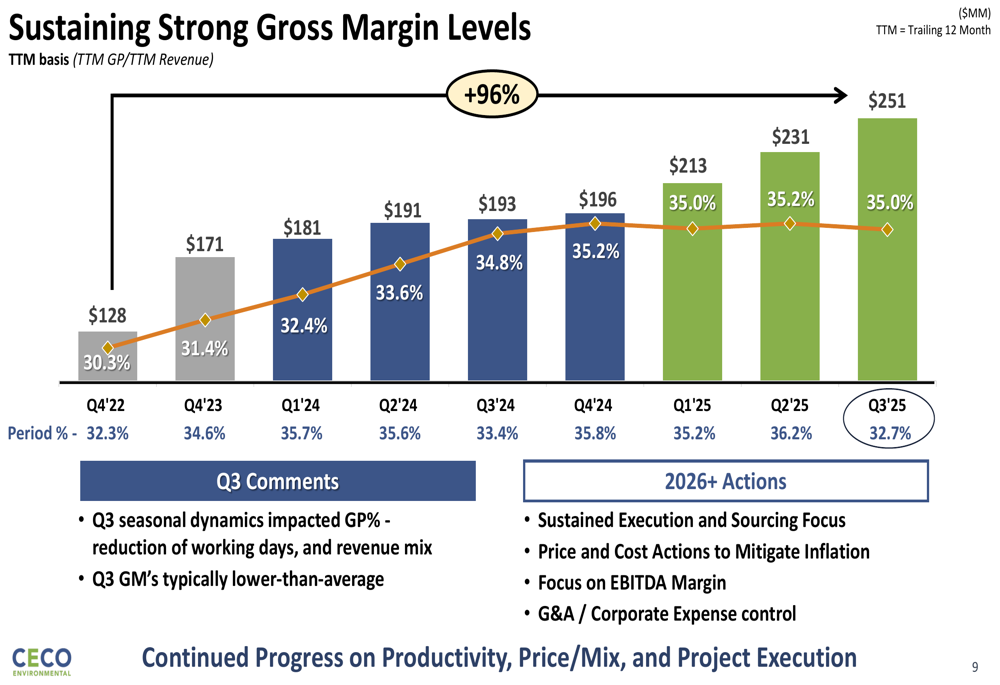 CECO has maintained strong gross margin levels despite seasonal dynamics and mix effects. The company reported Q3 gross margins of approximately 33%, flat year-over-year, with continued productivity and project execution offsetting mix and seasonal absorption dynamics.