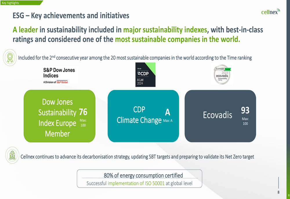 Cellnex continues to demonstrate leadership in sustainability, being included for the second consecutive year among the 20 most sustainable companies in the world according to Time magazine. The company achieved high scores across major sustainability indices, including a CDP Climate Change score of A and an EcoVadis Platinum rating with a score of 93/100.
