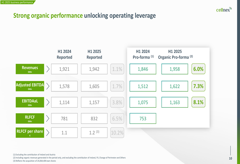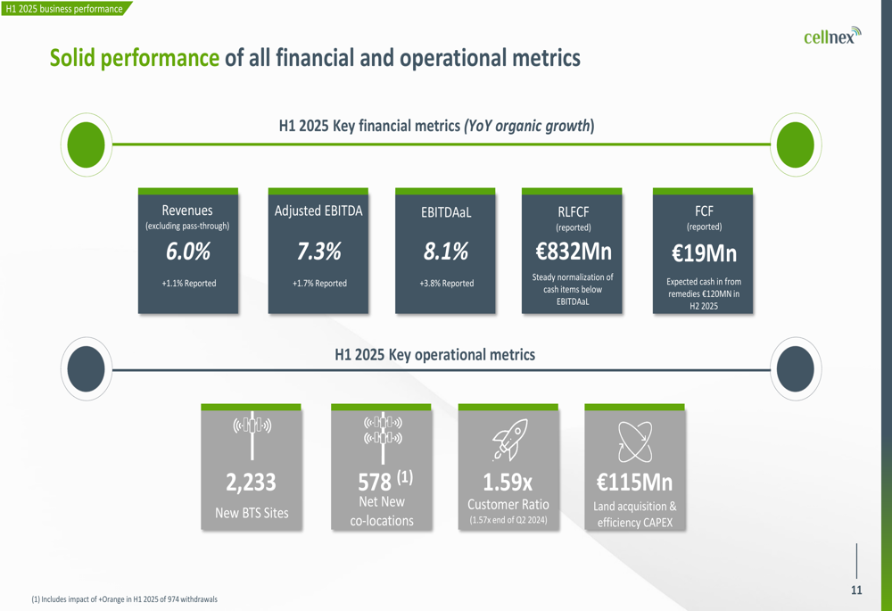 Cellnex delivered robust financial results for the first half of 2025, with revenues excluding pass-through reaching €1,942 million, representing 6.0% organic growth compared to the same period last year. The company’s adjusted EBITDA grew 7.3% on an organic basis to €1,605 million, while EBITDA after leases (EBITDAaL) increased 8.1% to €1,157 million.