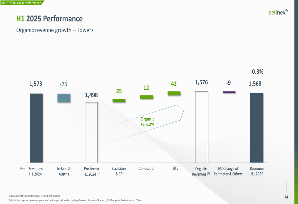 Tower business, which represents the core of Cellnex’s operations, showed strong organic growth of 5.2%, though reported revenues declined slightly by 0.3% to €1,568 million due to divestments: