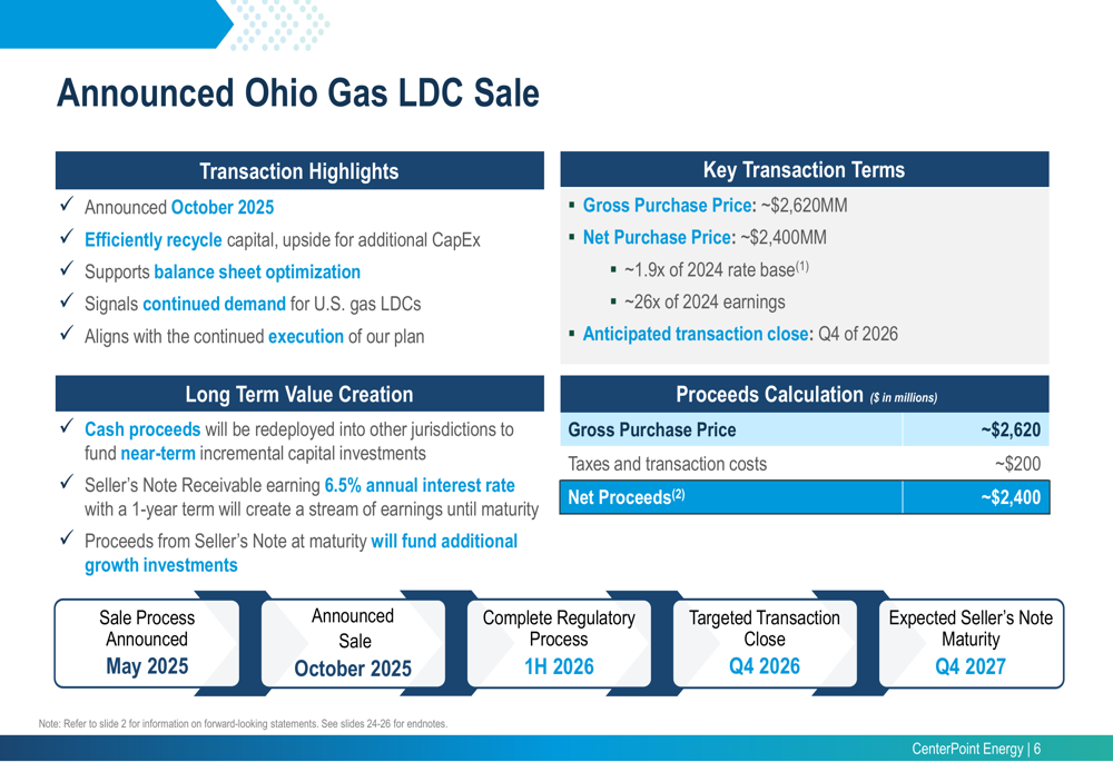 A key strategic development announced in the presentation was the sale of CenterPoint’s Ohio Gas LDC business, which is expected to generate approximately $2.62 billion in gross proceeds (about $2.4 billion net of taxes and transaction costs). The transaction, valued at approximately 1.9x 2024 rate base and 26x 2024 earnings, is anticipated to close in Q4 2026.