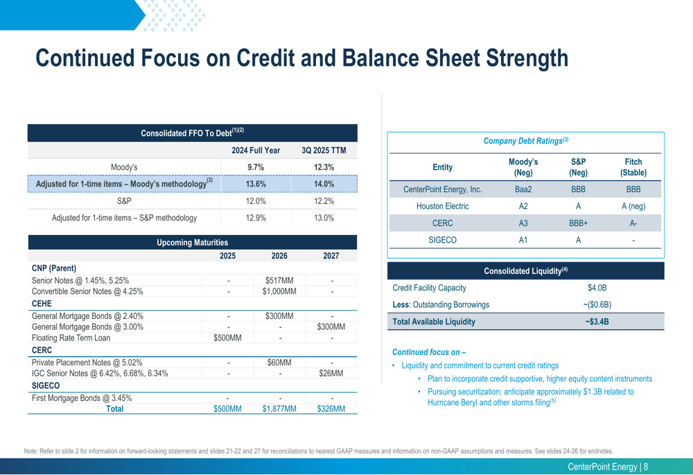 CenterPoint emphasized its commitment to maintaining balance sheet strength throughout the execution of its ambitious capital plan. The company reported a trailing twelve-month FFO to Debt ratio of 14.0% (adjusted, using Moody’s methodology) as of Q3 2025, providing a cushion above rating agency thresholds.