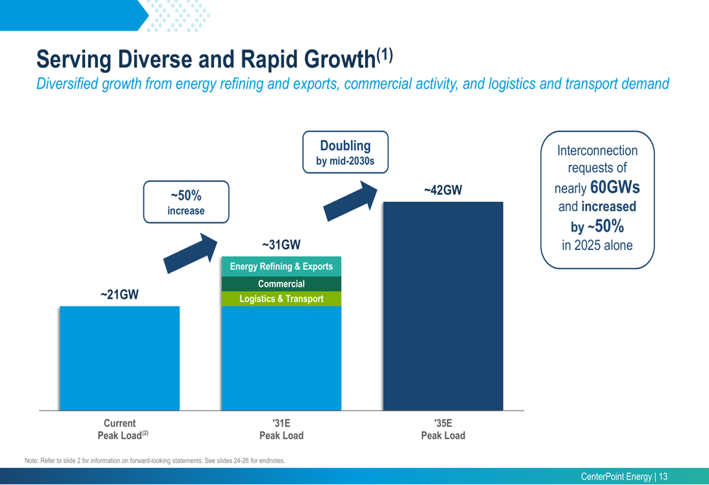 CenterPoint’s presentation highlighted the significant growth expected in its service territories, particularly in electric load. The company projects its peak load to increase from approximately 21GW currently to 31GW by 2031 (a 50% increase) and to 42GW by 2035 (a 100% increase).