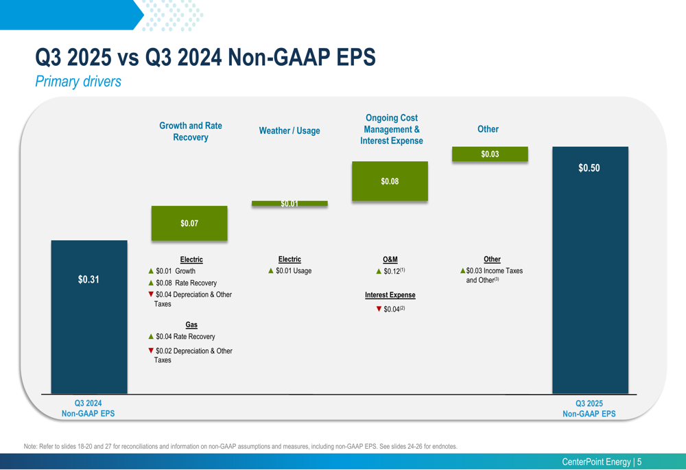 CenterPoint delivered a non-GAAP EPS of $0.50 for the third quarter, representing a substantial 60% increase from $0.31 in the same period last year and exceeding analyst expectations of $0.44. The company reaffirmed its 2026 non-GAAP EPS guidance range of $1.89-$1.91.