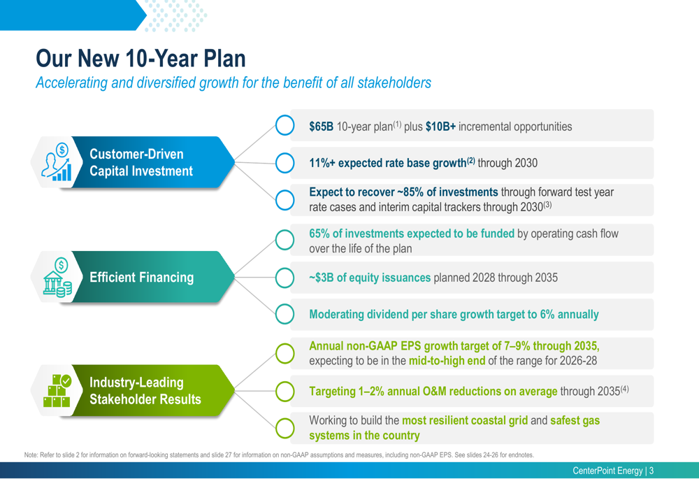 The centerpiece of CenterPoint’s presentation was its new 10-year strategic plan, which outlines a comprehensive approach to capital deployment, financial targets, and operational improvements through 2035.
