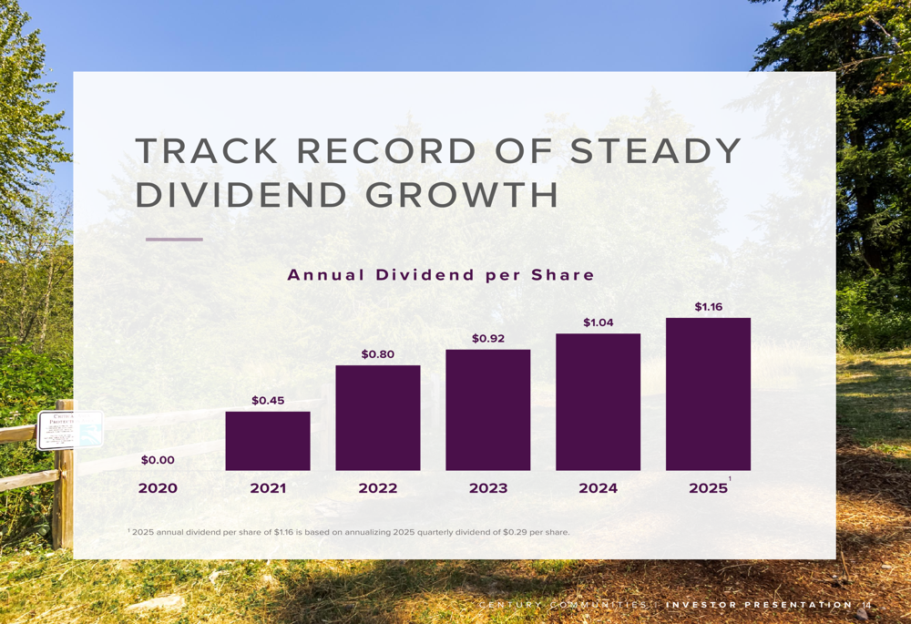 Century Communities has demonstrated a commitment to shareholder returns through consistent dividend growth. The company initiated its dividend program in 2021 at $0.45 annually and has increased it steadily to $1.16 in 2025, representing a 1.93% yield. Additionally, the company repurchased 296,903 shares for $20.0 million in Q3 2025, bringing year-to-date repurchases to 1,933,842 shares, approximately 6.2% of shares outstanding at the beginning of the year.