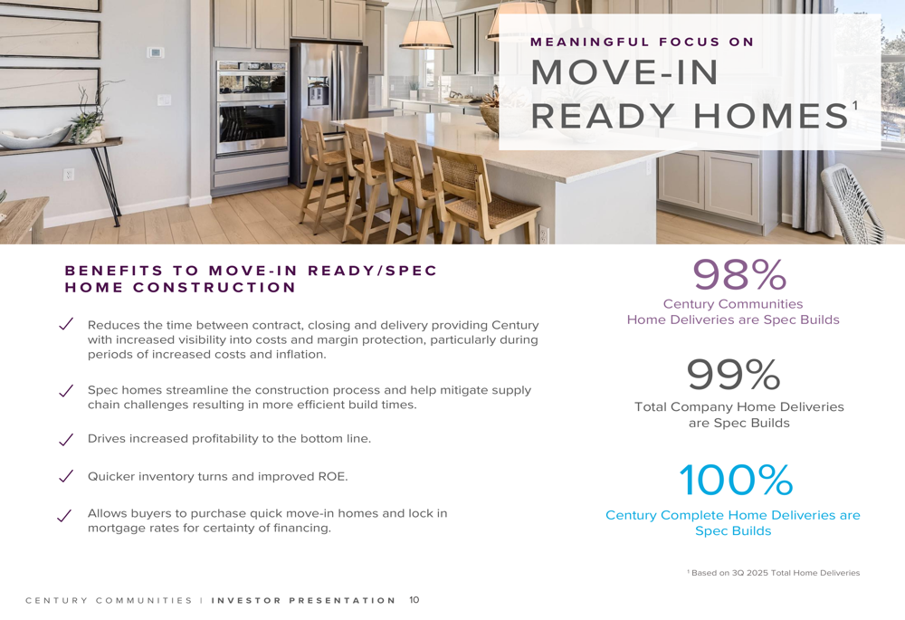 A key differentiator in Century’s business model is its emphasis on spec home construction, with 98% of homes delivered being spec builds. This approach reduces the time between contract and closing, streamlines the construction process, and helps mitigate the impact of inflation on costs.
