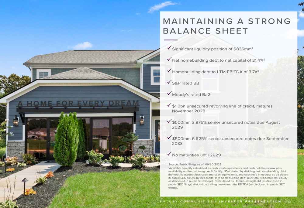 The company has maintained a strong balance sheet with significant liquidity of $836 million and a net homebuilding debt to net capital ratio of 31.4%. Century Communities holds investment-grade ratings from major credit agencies (S&P:BB, Moody’s: Ba2) and has no debt maturities until 2029, providing financial flexibility to navigate market cycles.