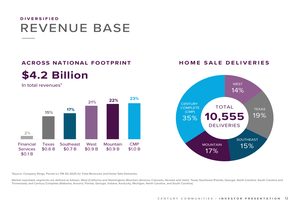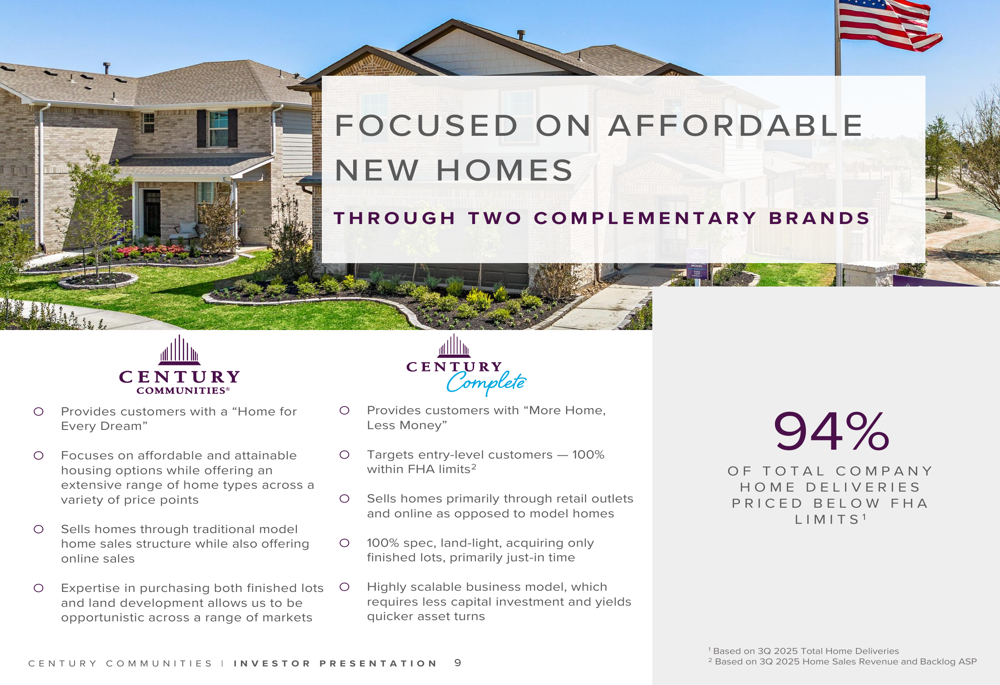 Century Communities operates through two complementary brands targeting the affordable housing segment. The Century Communities brand focuses on attainable housing with a traditional model home sales structure, while Century Complete targets entry-level customers with a "More Home, Less Money" value proposition, selling primarily through retail outlets and online. Notably, 94% of the company’s total home deliveries are priced below FHA limits, underscoring its commitment to affordable housing.