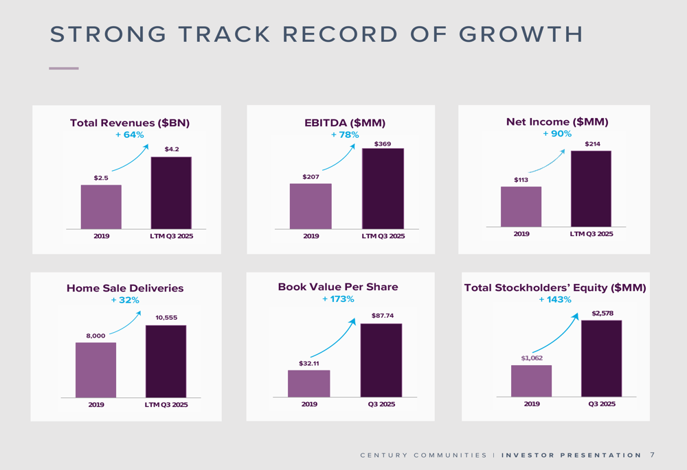 Century Communities has demonstrated impressive growth across key financial metrics over recent years. From 2019 to the last twelve months ending Q3 2025, the company increased total revenues by 64% to $4.2 billion, grew EBITDA by 78% to $369 million, and expanded net income by 90% to $214 million. Home sale deliveries rose 32% to 10,555 during this period, while book value per share surged 173% to $87.74.