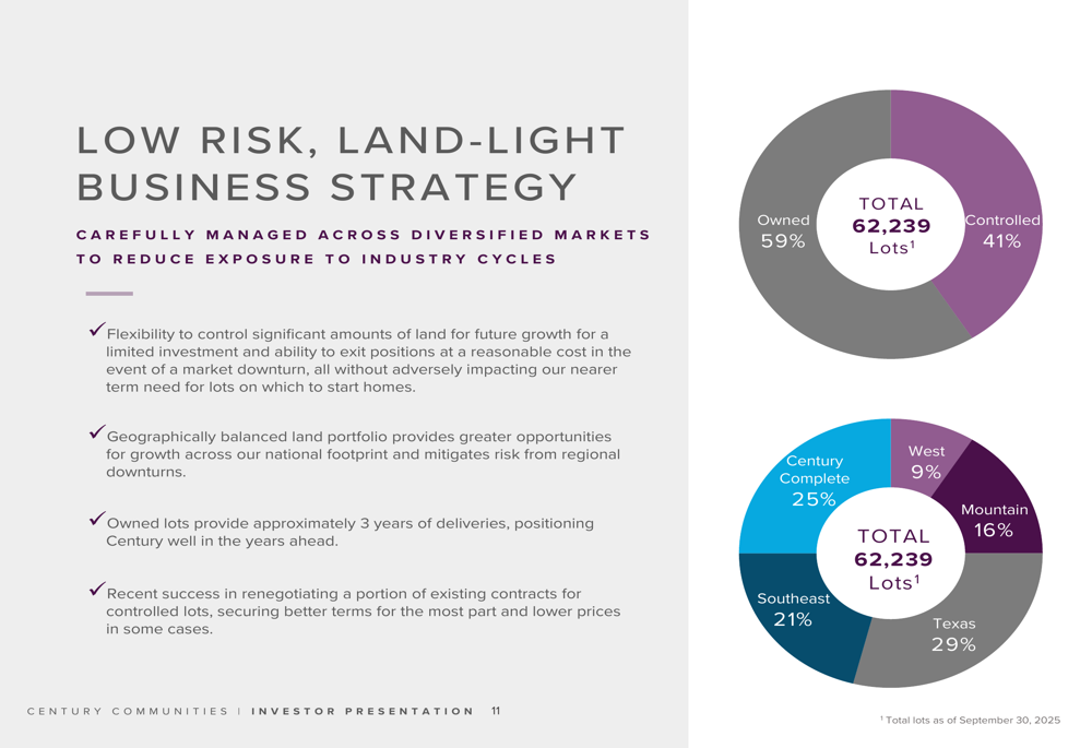 The company employs a land-light business strategy to reduce risk while maintaining flexibility for growth. Of its total 62,239 lots, 59% are owned and 41% are controlled through options. This approach provides the company with approximately three years of delivery supply while limiting capital exposure. The land portfolio is geographically balanced, with Century Complete representing 25% of lots, followed by Texas (29%), Southeast (21%), Mountain (16%), and West (9%).