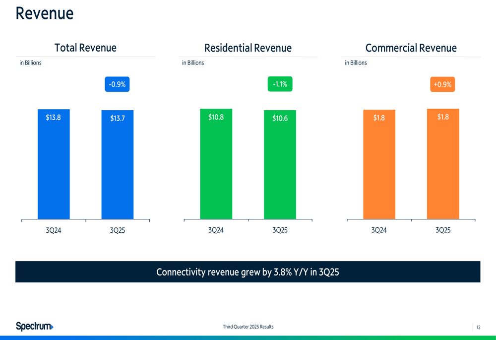 Breaking down Charter’s revenue components, residential revenue was $10.6 billion in Q3 2025, down from $10.8 billion in Q3 2024. Commercial revenue remained flat at $1.8 billion. However, connectivity revenue grew by 3.8% year-over-year, showing strength in the company’s core business.