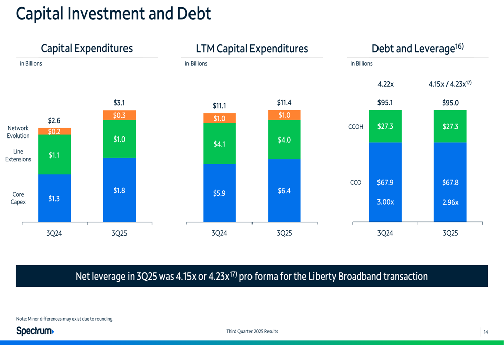 Capital expenditures for Q3 2025 included $1.8 billion in core capex, $1.0 billion in line extensions, and $0.3 billion in network evolution, totaling $3.1 billion. The company’s net leverage ratio stood at 4.15x, or 4.23x pro forma for the Liberty Broadband transaction, with total debt of $95 billion.