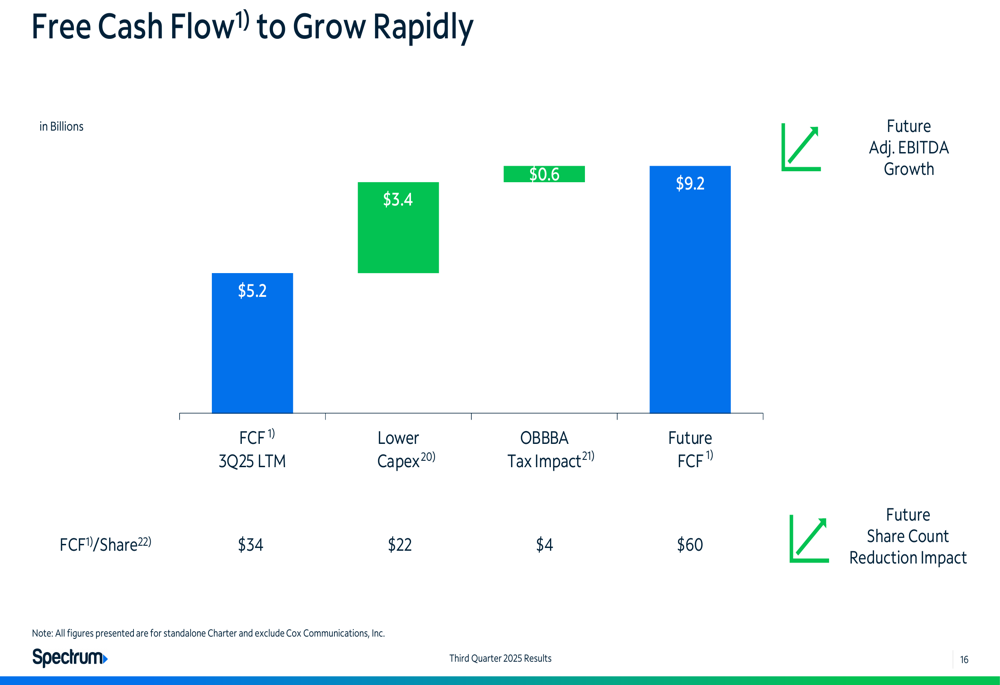 Despite current challenges, Charter is focusing on future free cash flow growth. The company generated $1,621 million in free cash flow during Q3 2025, slightly up from $1,619 million in Q3 2024, while LTM free cash flow increased to $5,215 million from $4,334 million.