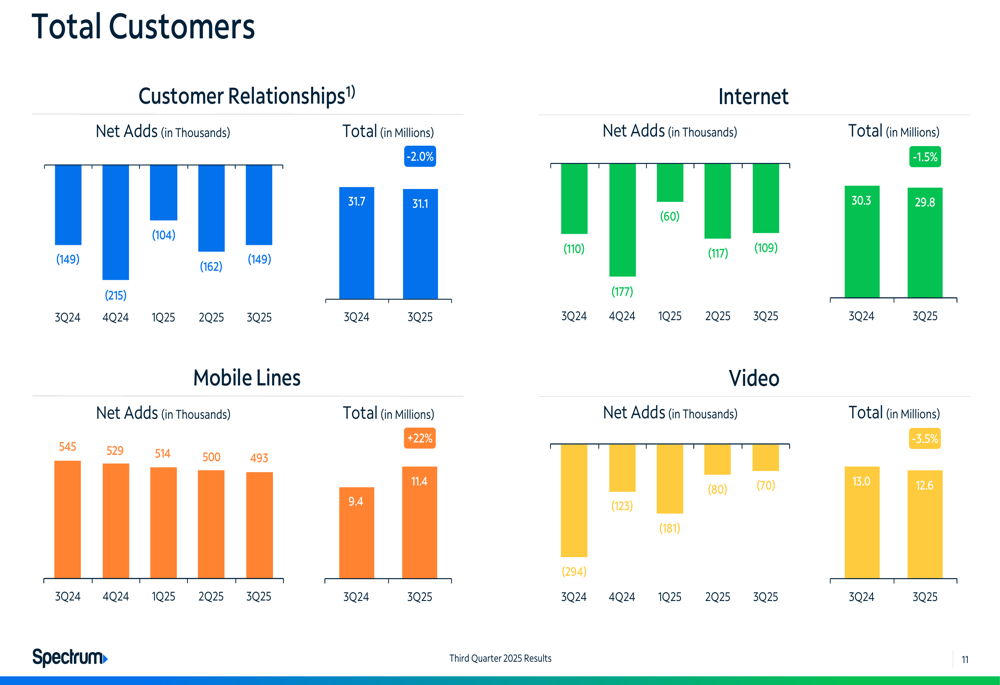 The company’s customer metrics revealed contrasting trends across different segments. Total customer relationships declined to 31.1 million, down from 31.7 million in Q3 2024. Internet customers decreased by 109,000 during the quarter to 29.8 million, while video subscribers fell by 70,000 to 12.6 million.