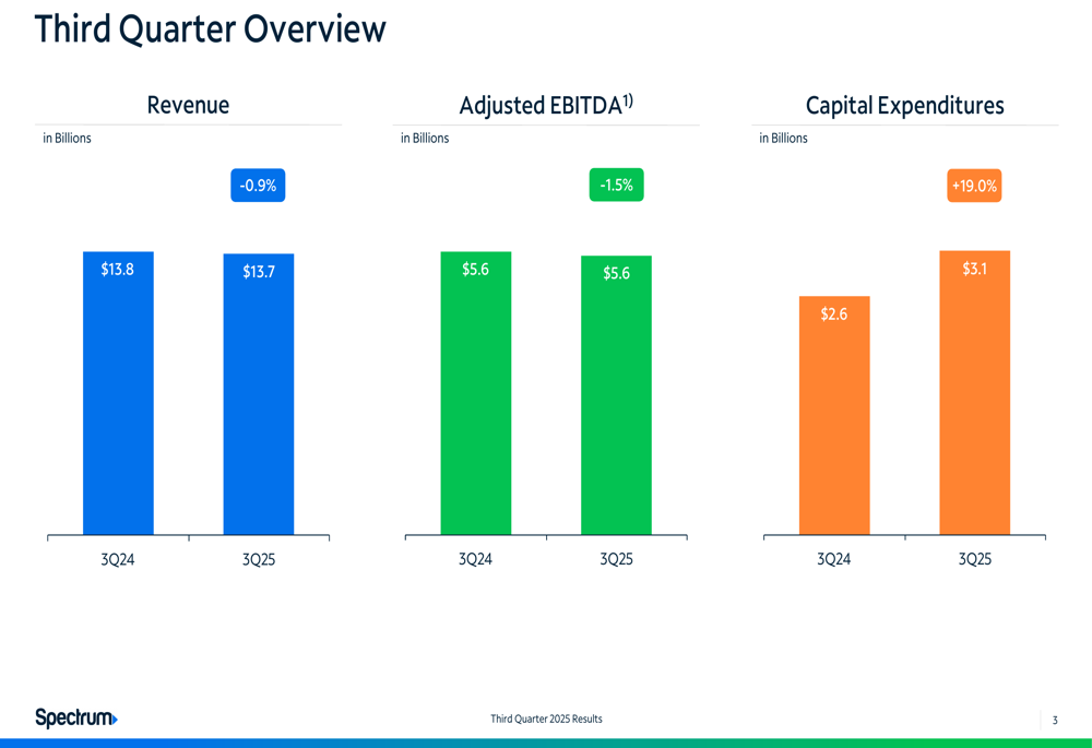 Charter’s third-quarter financial results showed year-over-year declines in key metrics. Revenue decreased by 0.9% to $13.7 billion, while adjusted EBITDA fell by 1.5% to $5.6 billion compared to the same period in 2024. Capital expenditures increased significantly by 19.0% to $3.1 billion.
