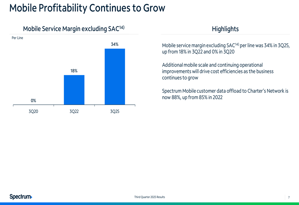 Charter is positioning itself as a value leader in the telecommunications market, emphasizing its competitive pricing compared to major wireless carriers. The company highlighted its mobile profitability improvements, with mobile service margin excluding subscriber acquisition costs reaching 34% in Q3 2025, up from 18% in Q3 2022 and 0% in Q3 2020.