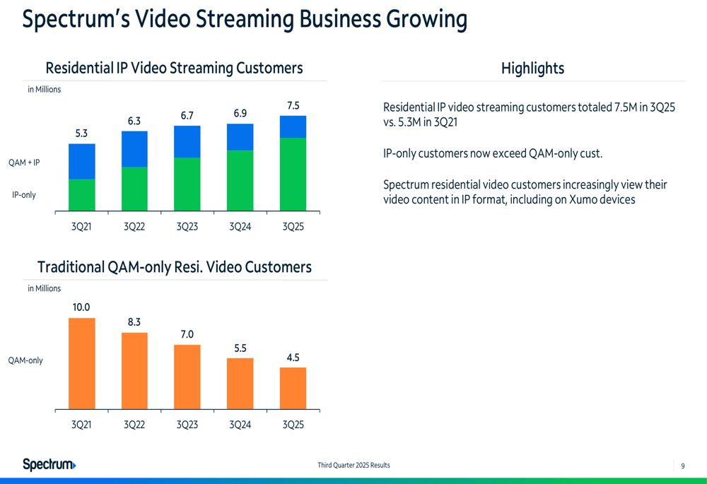 Charter is also successfully transitioning its video business from traditional cable to streaming platforms. Residential IP video streaming customers totaled 7.5 million in Q3 2025, up from 5.3 million in Q3 2021, with IP-only customers now exceeding traditional QAM-only customers.