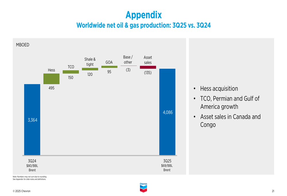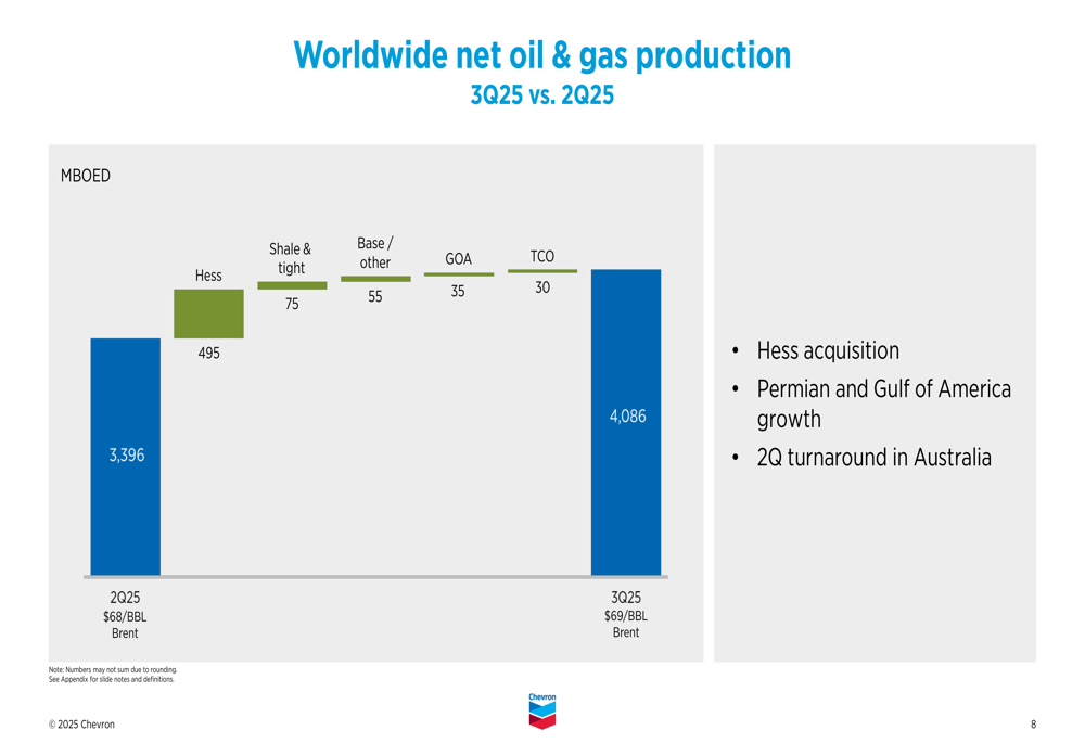 Year-over-year production growth was even more pronounced, with Q3 2025 production up 21.5% from 3,364 MBOED in Q3 2024. Besides the Hess acquisition (+495 MBOED), significant contributions came from TCO (+150 MBOED), shale and tight oil (+120 MBOED), and Gulf of America operations (+95 MBOED). These gains were partially offset by asset sales in Canada and Congo (-135 MBOED).
