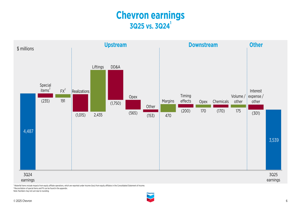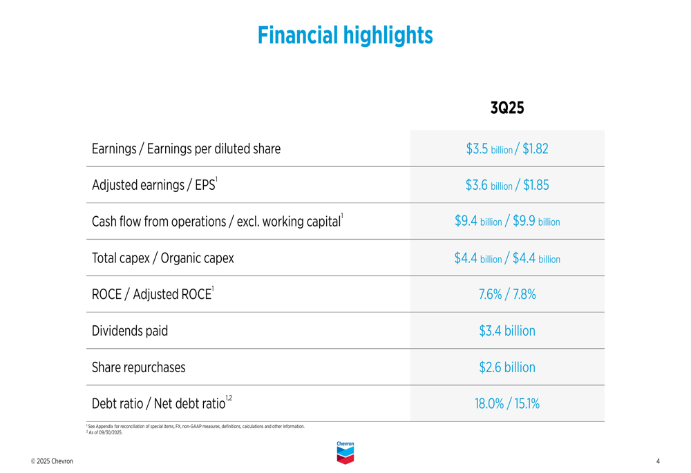 Chevron reported earnings of $3.5 billion ($1.82 per diluted share) for the third quarter of 2025, compared to $2.49 billion in Q2 2025 and $4.49 billion in Q3 2024. On an adjusted basis, earnings were $3.6 billion ($1.85 per diluted share), beating market expectations.