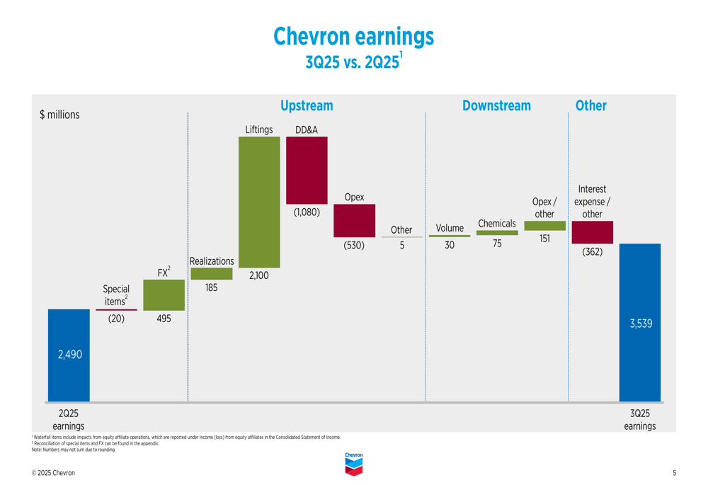 The sequential improvement in Chevron’s earnings from Q2 2025 to Q3 2025 was driven by several factors. As illustrated in the company’s waterfall chart, the $1.05 billion increase in earnings was primarily due to higher liftings (+$2.1 billion) and favorable foreign exchange impacts (+$495 million). These gains were partially offset by increased depreciation, depletion, and amortization expenses (-$1.08 billion) and higher operating expenses (-$530 million).
