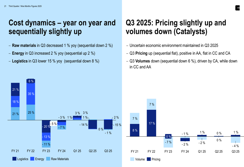 The company’s cost dynamics show mixed trends, with raw material costs decreasing 1% year-over-year in Q3, while energy costs increased 2%. Logistics costs declined significantly, down 15% compared to the previous year.