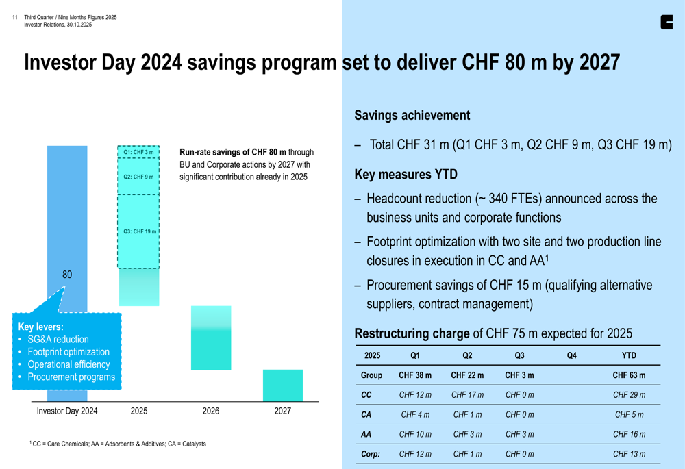 The savings program includes headcount reduction of approximately 340 full-time employees, footprint optimization with two site and two production line closures, and procurement savings of CHF 15 million. Clariant has incurred CHF 63 million in restructuring charges year-to-date out of an expected CHF 75 million for the full year.