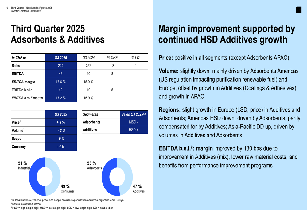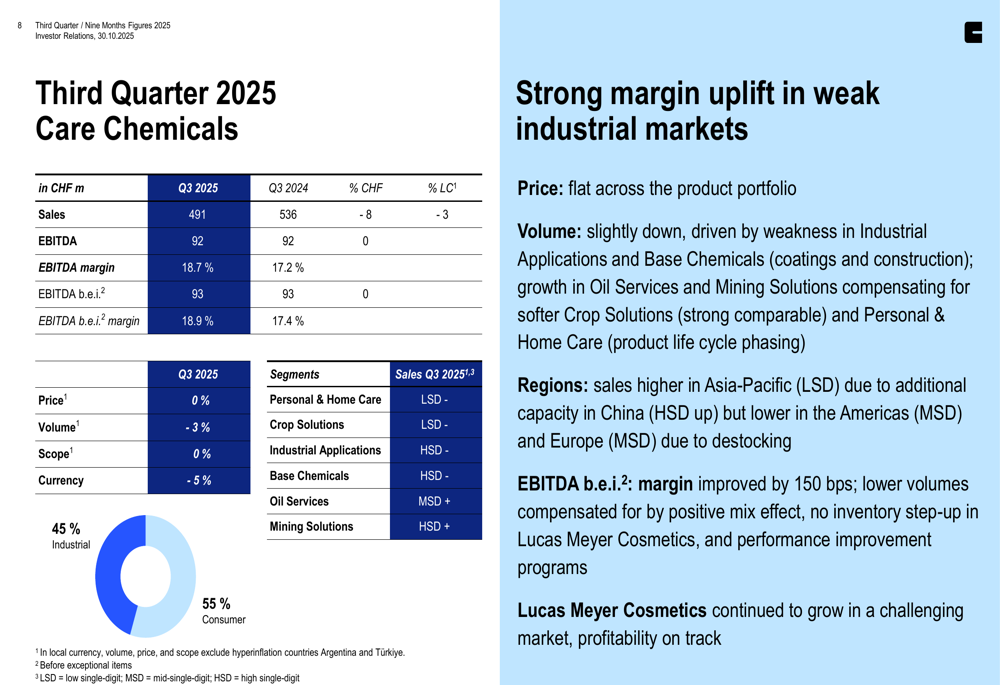 Care Chemicals, Clariant’s largest division, reported sales of CHF 491 million in Q3, down 8% in Swiss francs and 3% in local currency. Despite the sales decline, the division improved its EBITDA margin before exceptional items to 18.9%, up from 17.4% in Q3 2024.
