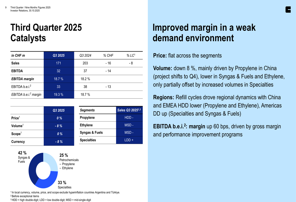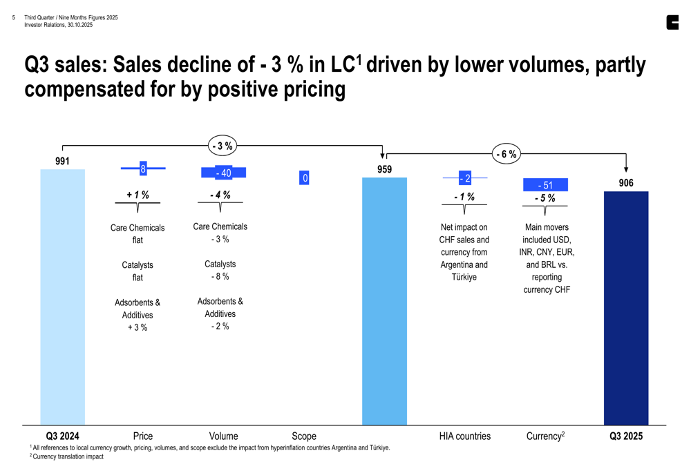 Clariant’s Q3 2025 sales reached CHF 906 million, down 3% in local currency and 9% in Swiss francs due to a significant negative currency translation impact of 5%. Despite lower volumes, the company achieved EBITDA before exceptional items of CHF 162 million, representing a margin of 17.9% compared to 15.6% in the same period last year.