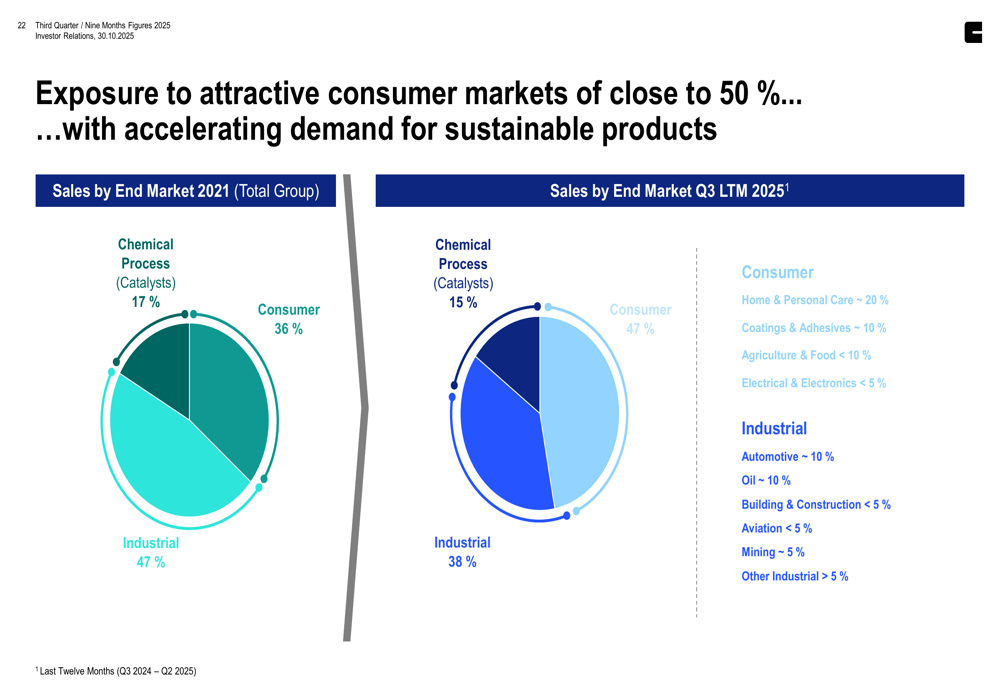 Clariant has strategically shifted its portfolio toward consumer markets, which now represent 47% of sales compared to 36% in 2021. This transition has reduced exposure to more cyclical industrial markets, which decreased from 47% to 38% of sales during the same period.