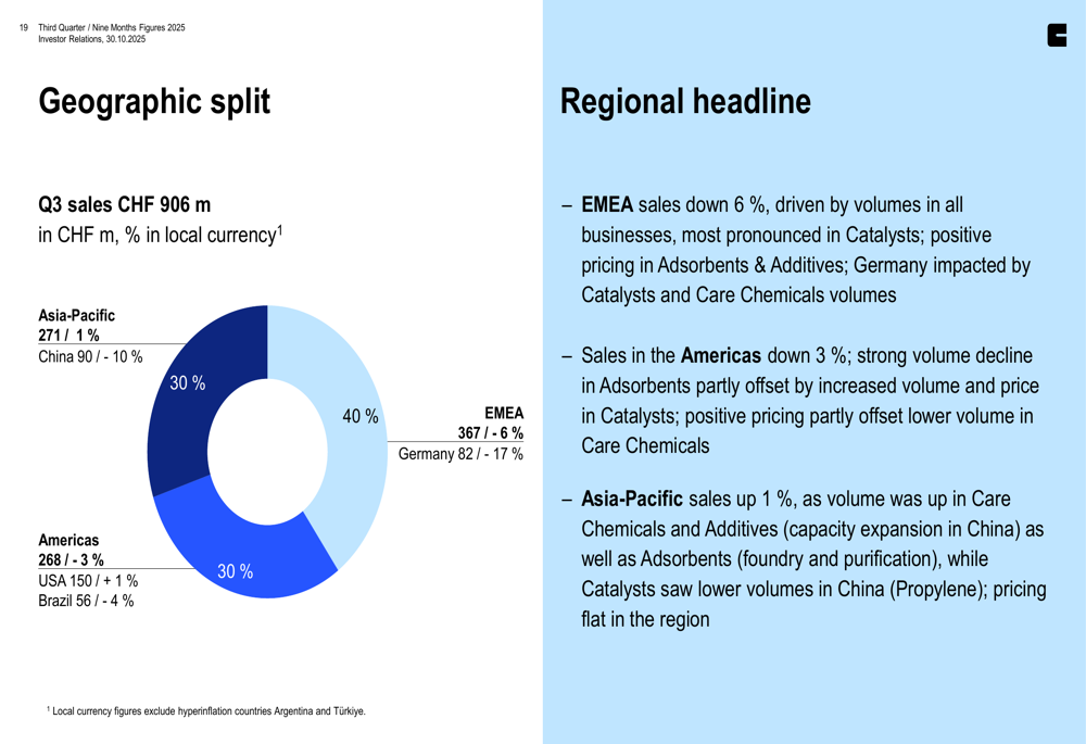 Clariant’s geographic performance reveals regional variations, with Asia-Pacific showing modest 1% growth in local currency, while the Americas (-3%) and EMEA (-6%) experienced declines. China remained particularly challenging with a 10% sales decrease.