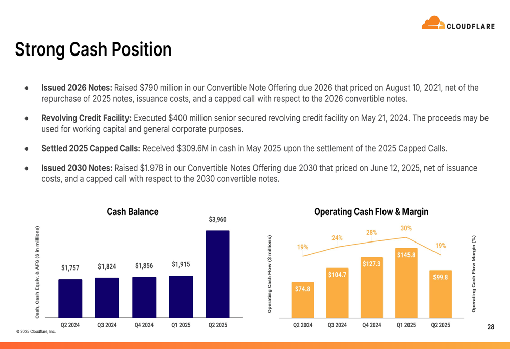 Cloudflare’s cash position has strengthened significantly, with cash and investments growing from $1.76 billion in Q2 2024 to $3.96 billion in Q2 2025, providing substantial resources for future investments and potential acquisitions:
