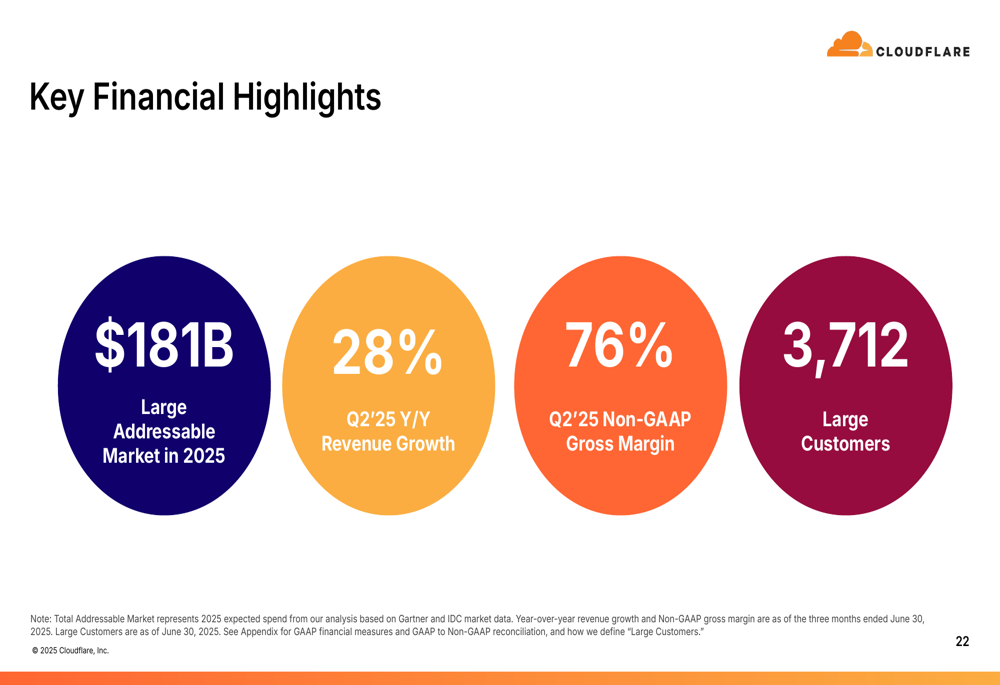 The company’s customer acquisition strategy continues to yield results, with total paying customers reaching 265,929 in Q2 2025, up from 210,166 in Q2 2024. More importantly, large customers (those spending over $100,000 annually) grew 22% year-over-year to 3,712, demonstrating Cloudflare’s success in moving upmarket.