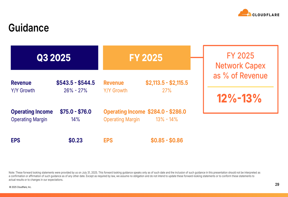 Cloudflare provided positive guidance for Q3 2025, projecting revenue between $543.5-544.5 million, representing 26-27% year-over-year growth. For the full fiscal year 2025, the company expects revenue of $2,113.5-2,115.5 million, maintaining 27% annual growth.