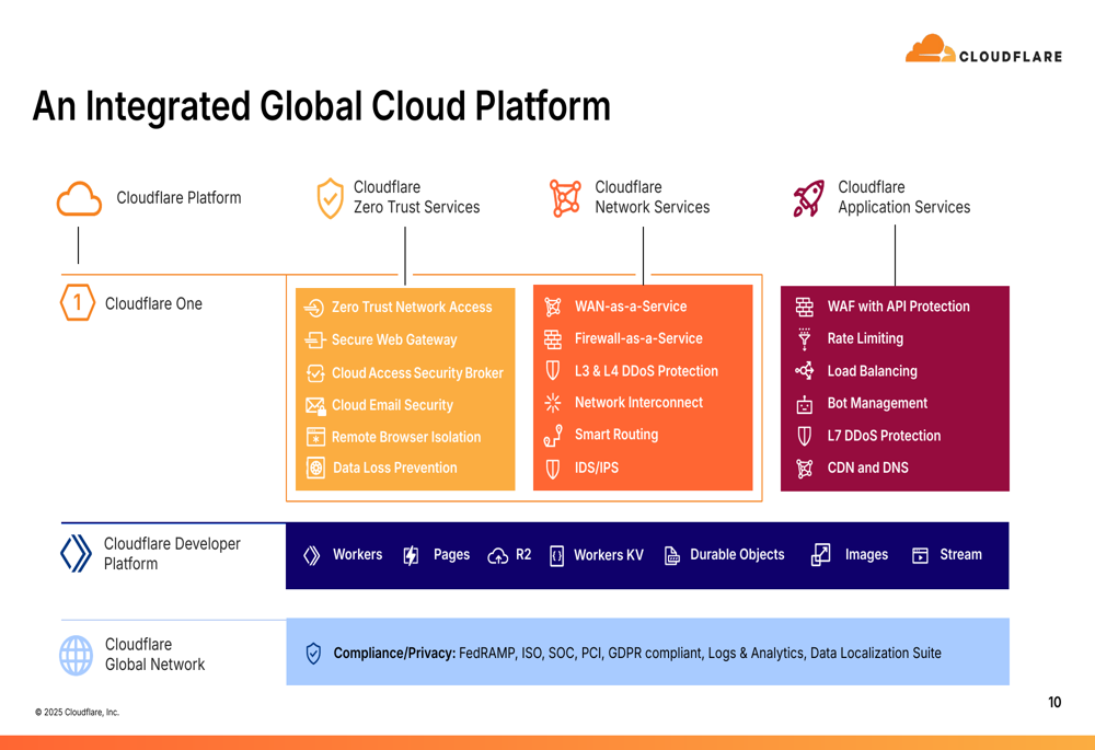 Cloudflare’s serverless architecture, deployed on commodity hardware with a single software stack across its network, provides significant operational efficiencies and cost advantages over traditional hardware-based solutions. This architecture also enables rapid innovation and seamless product integration.