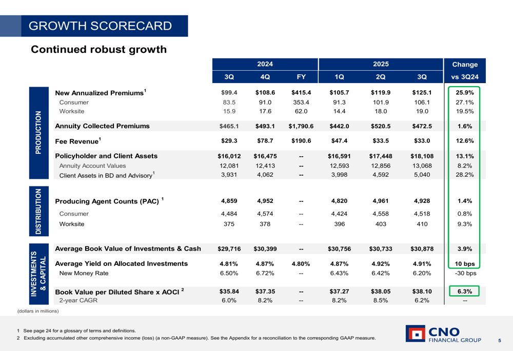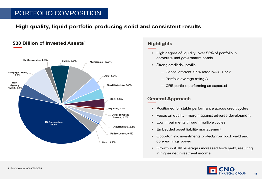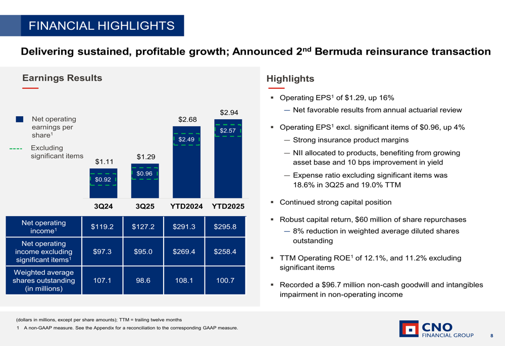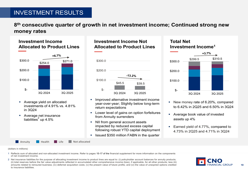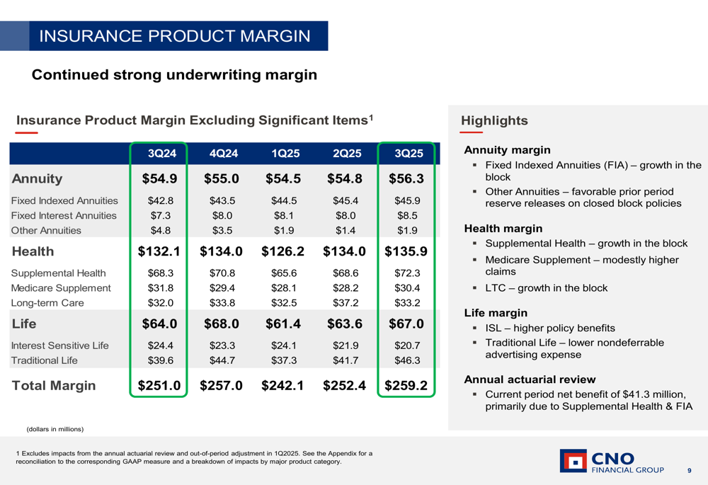 CNO’s financial performance showed strength across multiple metrics, with operating EPS excluding significant items at $0.96, up 4% year-over-year. The company attributed this growth to strong insurance product margins and improved net investment income.