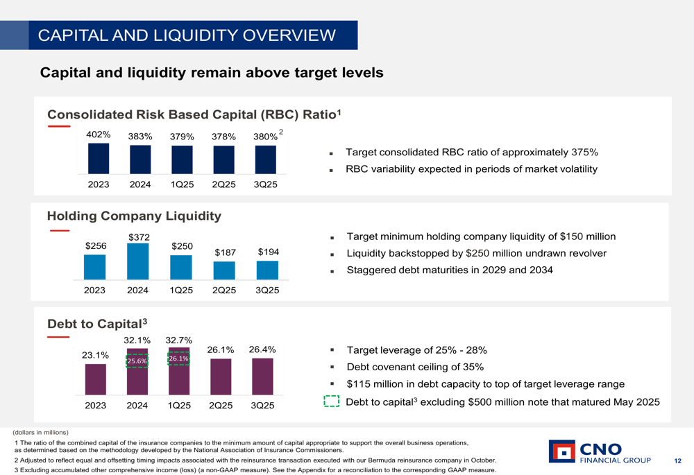 CNO maintained a strong capital position with a consolidated risk-based capital ratio of 380%, slightly above its target of approximately 375%. The company returned $76 million to shareholders in the quarter through dividends and share repurchases, bringing the year-to-date total to $310 million.
