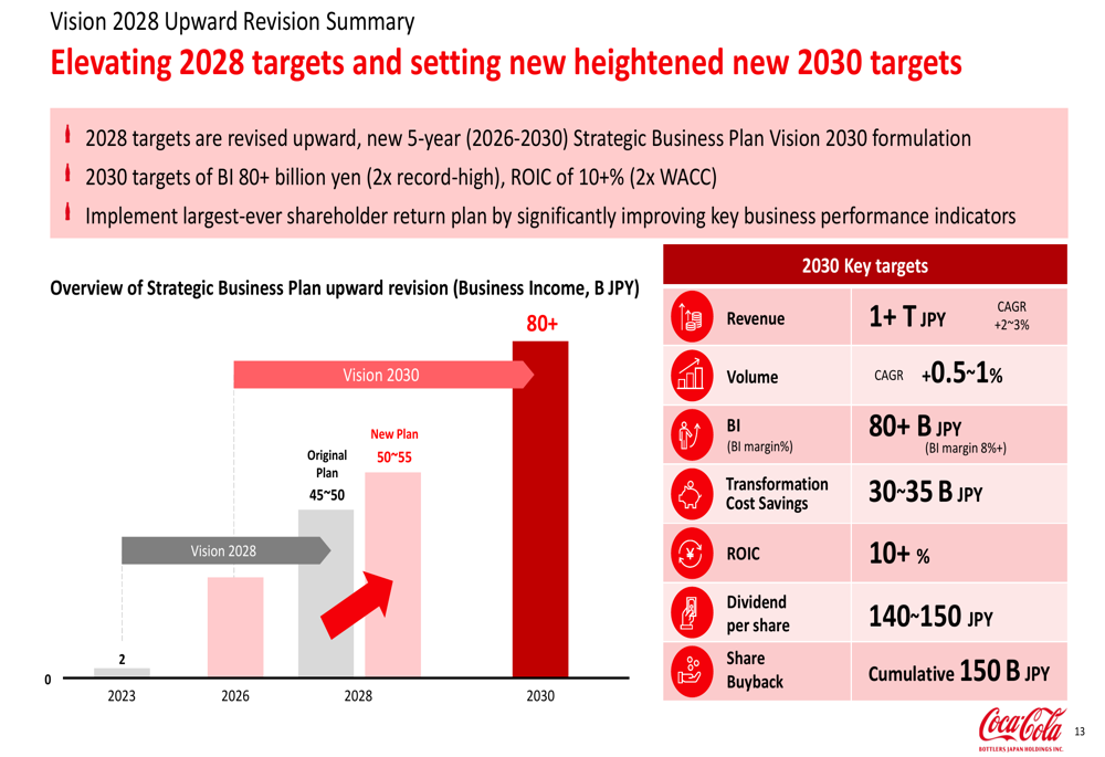 A major focus of the presentation was the introduction of "Vision 2030," CCBJH’s new strategic business plan that builds upon and significantly expands the targets from its previous Vision 2028 plan. The company cited positive business operations, strong determination to achieve higher ambitions, and progress toward enhanced shareholder returns as key reasons for the upward revision.