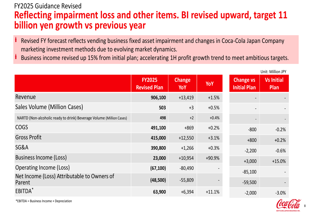CCBJH revised its full-year 2025 guidance, targeting business income of ¥23 billion, which is 15% higher than its initial plan and represents a 90.9% year-over-year increase. However, the company expects to report a significant net loss for the year due to the vending business impairment.