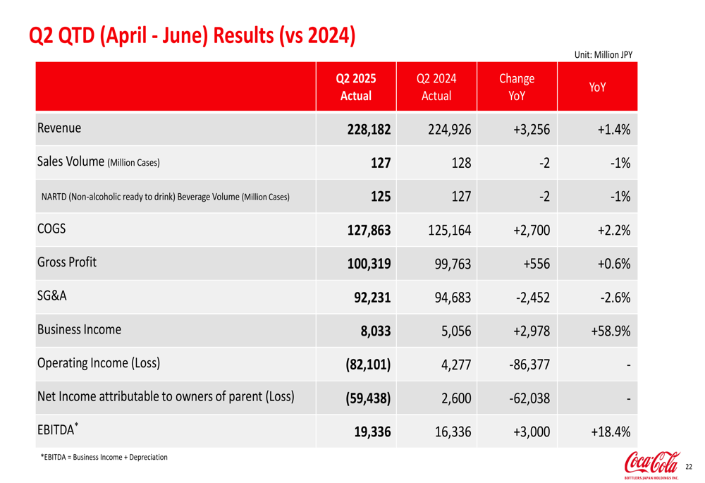 For the second quarter specifically, CCBJH reported revenue of ¥228,182 million, a 1.4% increase year-over-year, while business income surged 58.9% to ¥8,033 million. However, the quarter’s operating income showed a loss of ¥82,101 million due to the impairment charge, compared to a positive ¥4,277 million in Q2 2024.