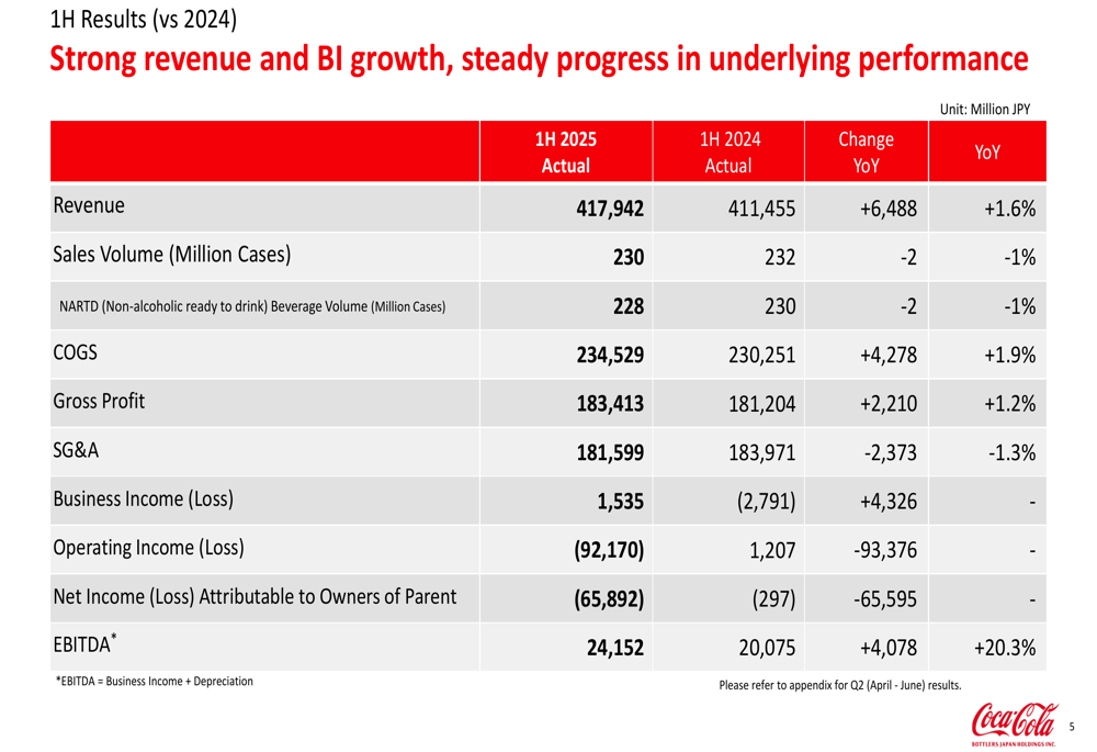 CCBJH reported first-half revenue of ¥417,942 million, representing a 1.6% year-over-year increase despite a 1% decline in sales volume. More significantly, the company achieved a positive business income of ¥1,535 million, a ¥4,326 million improvement from the ¥2,791 million loss recorded in the same period of 2024.