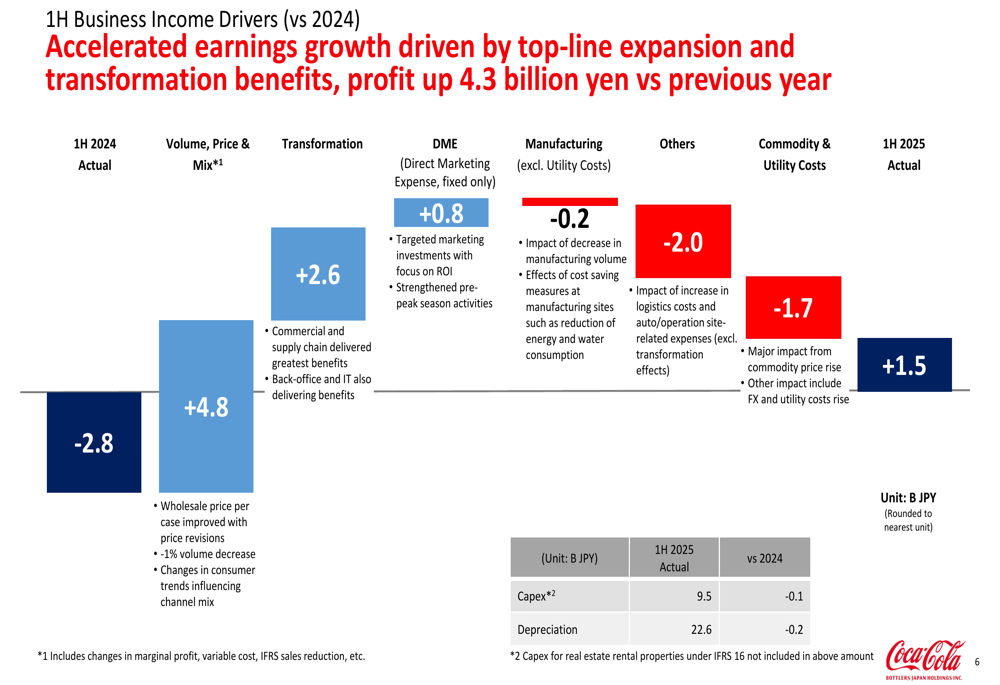 Price and mix contributed ¥4.8 billion to the improvement, while transformation initiatives added ¥2.6 billion and reduced direct marketing expenses provided another ¥0.8 billion. These positive factors were partially offset by increased commodity and utility costs (¥1.7 billion) and other expenses.