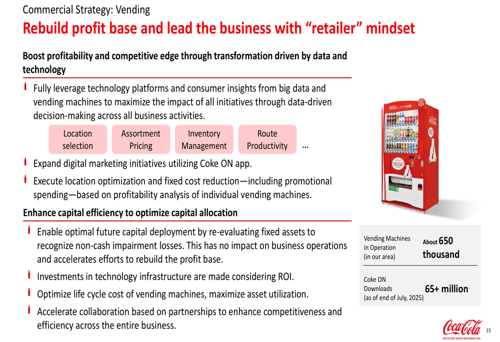 For the vending machine business, which represents a substantial portion of CCBJH’s operations with approximately 650,000 machines in operation, the company outlined a comprehensive strategy to rebuild its profit foundation: